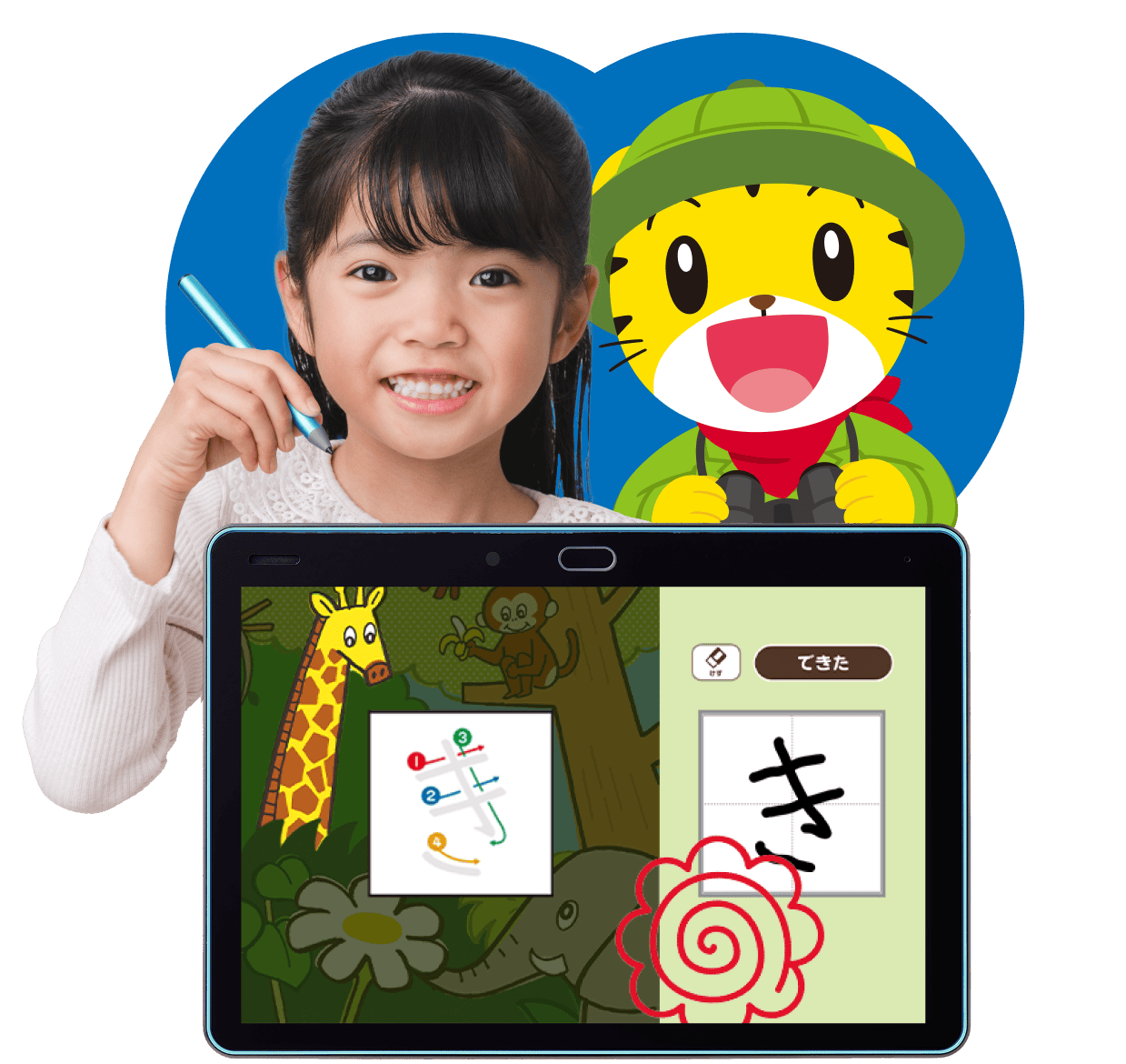 年長向け講座では、ひらがな・カタカナ・数の理解だけでなく、考える力や集中力を養います。タブレット学習にも対応し、デジタルと紙教材の両方から多角的に学べます。