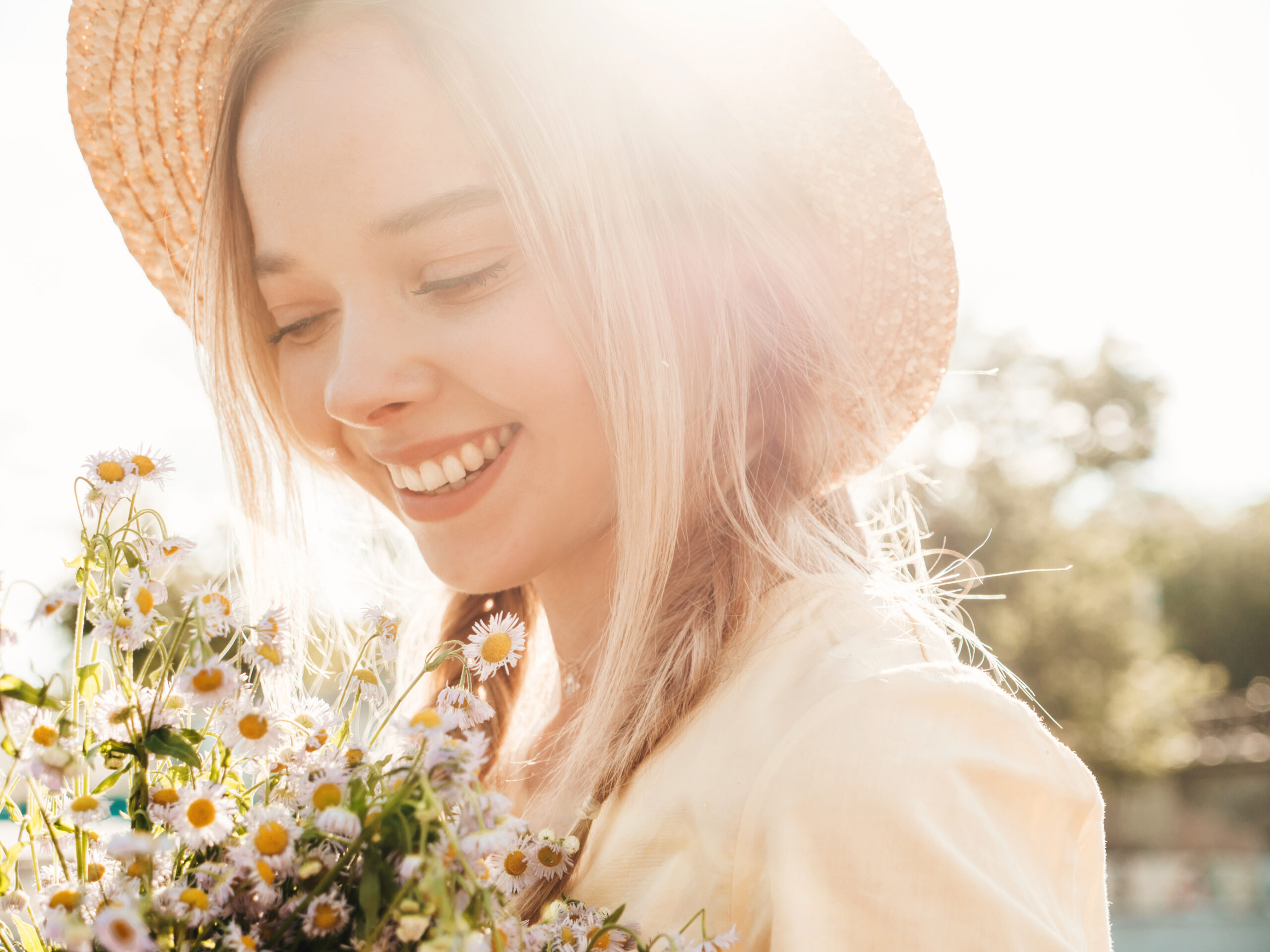 Young beautiful smiling hipster woman in trendy summer sundress. Sexy carefree woman posing on the street background in hat at sunset. Positive model outdoors on embankment. Holding flowers in hands