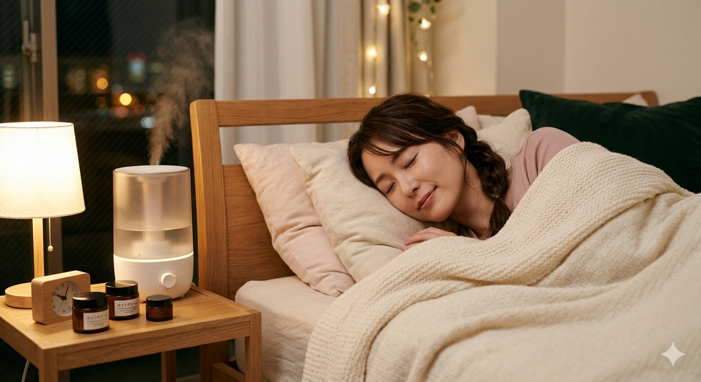 香りの活用も有効です。ラベンダーやサンダルウッド、ベルガモットなど、鎮静効果のあるアロマは、脳のリラックススイッチを入れてくれます。お気に入りの香りを枕元に少し忍ばせるだけで、呼吸が深くなり、眠りの質が格段に向上します。